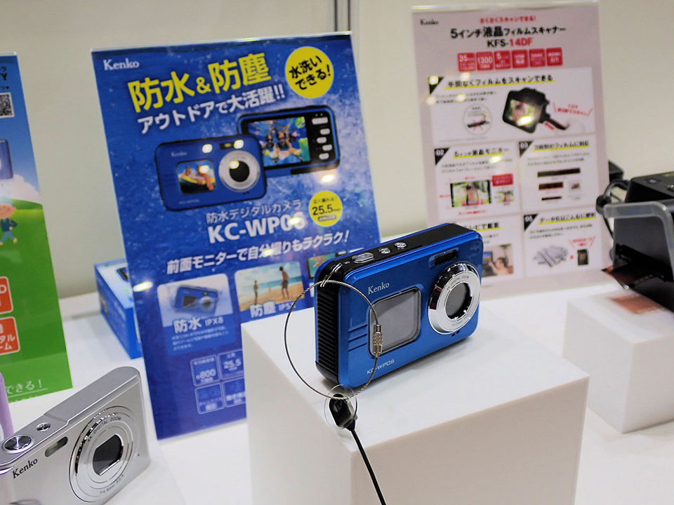Kenkoブースにあったのは、今でもこの手のカメラを売っているんだなあ~!と思わせるようなカメラ、KC-WP06でした。「広角単焦点、3.5m防水、800万画素」と、これだけを見ると数世代以上前の防水カメラですが、自撮り用モニター装備やフルHD動画撮影機能など、最近のデジカメの機能は入っています。水辺用カメラ・スナップ専用なら需要ありと見ているのかもしれませんね。