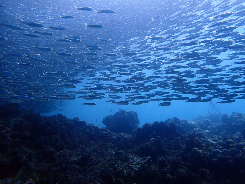 2日目以降のマクタンは天候も回復、中はバッチリ、透視度は20m程度と結構よい状態、お決まりのイワシの群れ、ヒメツバメウオの群れに何度も遭遇し、イワシに巻かれるのは初めてでした。