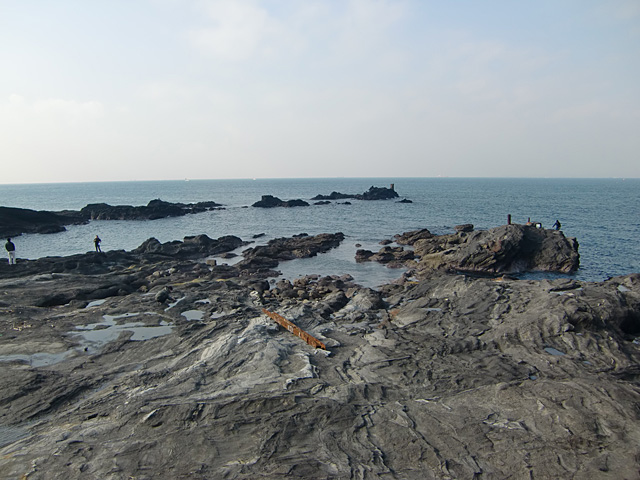 ポイントでは滑らかな磯場をほんのちょっと歩いてエントリーします。駐車場から磯へは鉄階段を降りてよいこらしょ。