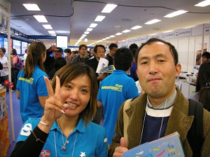 指導団体コーナーを抜けると、次は国内ダイビングゾーンです。ここを進んでいくと、何処かで見た顔の方が・・・。何と、アクアポポのしずちゃんこと原村静枝さんでした。本部町の他ショップの手伝いでの参加とのことでした。
